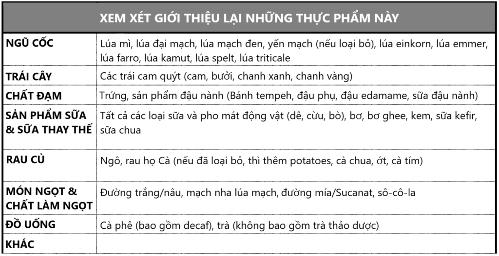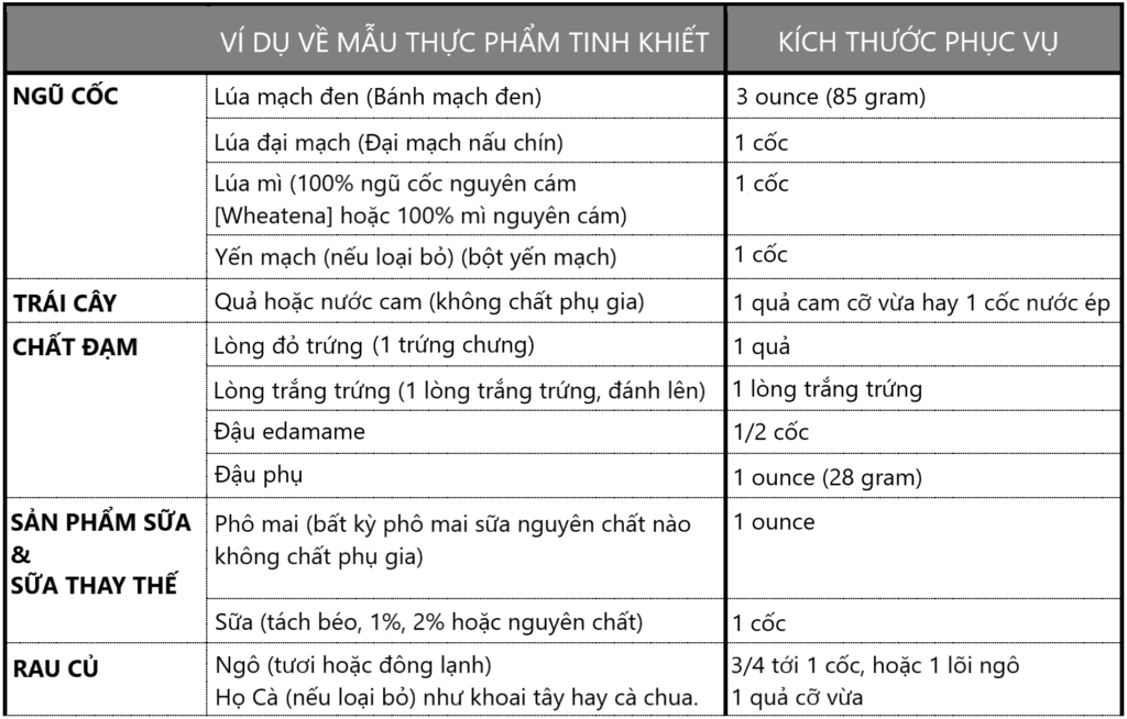 Lặp lại bước 2 và bước 3 cho từng nhóm thực phẩm. Nếu bất kỳ lúc nào trong quá trình này, bạn có bất kỳ câu hỏi nào, vui lòng liên hệ với nhà cung cấp dịch vụ chăm sóc sức khỏe của bạn.